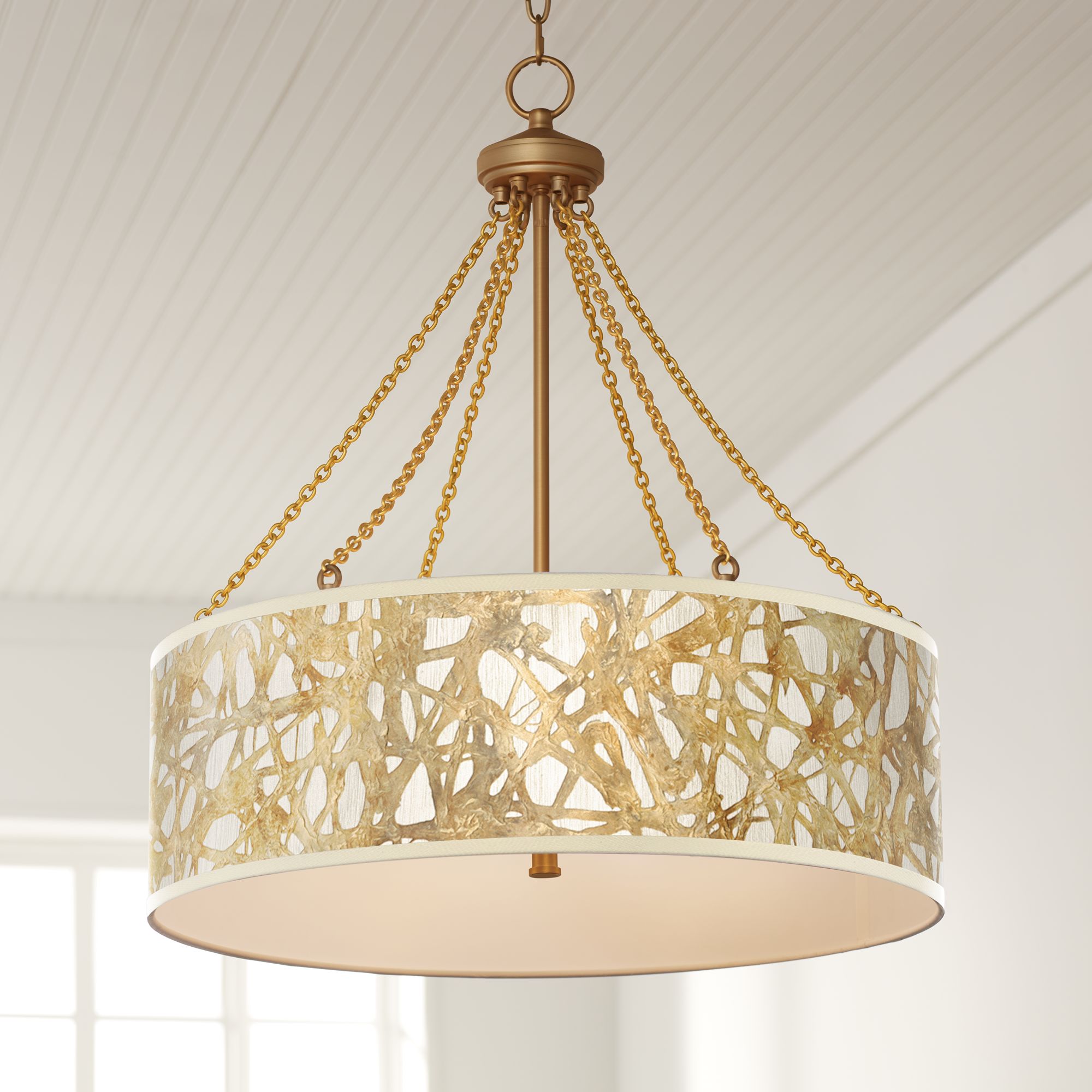 Natural and sustainable, the knotted rattan outer shade is finished in a hand rubbed ivory tone with brown dry brushing and a gray glaze and an inner fabric liner of beige linen. The knotted rattan shade on this contemporary pendant chandelier will bring a rich, and decorative charm to your space. Designed by carolyn kinder, the knotted rattan drum has a shade that diffuses light through rattan loops in deep espresso or milky chai, as well as through the acrylic bottom diffuser. Pleasant and stuckey, south carolina area. We wanted a fixture with 5 pendants instead of the 3 that was offered.
